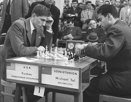 Δεν είχανμεγάλη διαφορά ηλικίας. 7 χρόνια τους χώριζαν. Το παρακάτω επεισόδιο, συνέβη το1959 στο τουρνουά των διεκδικητών του παγκοσμίου τίτλου της Γιουγκοσλαβίας. ΟΤαλ ήταν τότε 23 ετών και ο Φίσερ 16. Στο τουρνουά συμμετείχαν ονόματα-θρύλοι.Ένας κι ένας. Ίσως ένα από τα ισχυρότερα που έγιναν ποτέ. Οι διεκδικητές ήταν(στον τελικό περίμενε ο Μποτβίνικ): Ταλ, Κέρες, Πετροσιάν, Σμίσλοβ, Φίσερ,Μπένκο, Όλαφσον και Γκλίγκοριτς. Παρ’ ότι θα περίμενε κανείς να έχει γοητευθείο έφηβος Φίσερ (ήταν ο μικρότερος) από κάποιον από τους μεγάλους καιφημισμένους μετρ, αυτός είχε κολλήσει με τον αμέσως μεγαλύτερο, τον Ταλ.