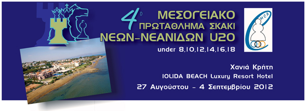 Το «4ο Μεσογειακό Πρωτάθλημα Σκάκι Νέων-Νεανίδων», κάτω των 20 ετών, θα διεξαχθεί στα Χανιά από 27 Αυγούστου (άφιξη) έως 4 Σεπτεμβρίου 2012 (αναχώρηση) στο ξενοδοχείο IOLIDA BEACH Luxury Resort Hotel*****, στη περιοχή Αγία Μαρίνα.