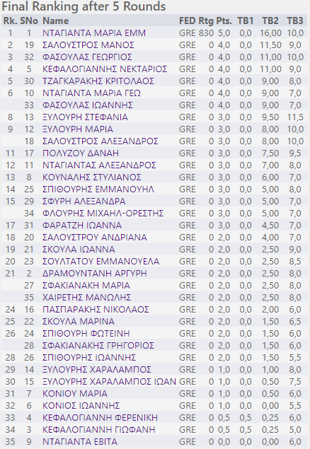 Στο αγωνιστικό κομμάτι το τουρνουά κατέκτησε η Μαρία Νταγιαντά του Εμμανουήλ με 5/5. Η Μαρία ήταν 1η γενικής κατάταξης και 1η στα κορίτσια, παίρνοντας το χρυσό μετάλλιο. Την 2η θέση στα κορίτσια (6η γενικής κατάταξης) και το ασημένιο μετάλλιο πήρε η Μαρία Νταγιαντά του Γεωργίου με 4/5, ενώ την 3η θέση στα κορίτσια (8η γενικής) και το χάλκινο μετάλλιο κατέκτησε η Στέφη Ξυλούρη με 3/5. Ισόβαθμες στην 3η θέση των κοριτσιών και οι Μαρία Ξυλούρη, Δανάη Πολύζου, Αλεξάνδρα Σφυρή και Ιωάννα Φαρατζή με 3/5 επίσης οι οποίες χάνουν το μετάλλιο στις λεπτομέρειες των κριτηρίων άρσης ισοβαθμίας.