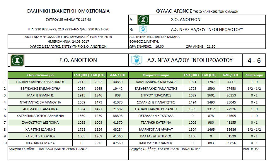 Δεν ξεκίνησε με τον καλύτερο τρόπο το διασυλλογικό Πρωτάθλημα της Β Εθνικής για τον Σκακιστικό Όμιλο Ανωγείων, καθώς έχασε από την ομάδα του Ηροδότου με σκορ 4 – 6. Οι αντίπαλοι μας έπαιξαν καλύτερα και κέρδισαν απολύτως δίκαια το παιχνίδι, αποδεικνύοντας ότι είναι μια πολύ καλή και μαχητική ομάδα η οποία έχει την δυνατότητα να παλέψει για την κατάκτηση του πρωταθλήματος.